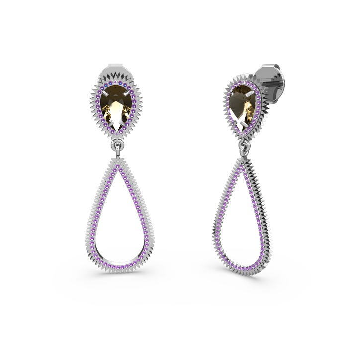 Ametist ve dumanlı kuvars 14 ayar beyaz altın küpe