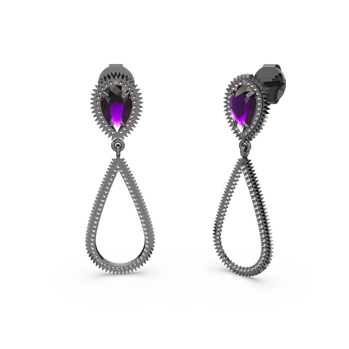 Dumanlı kuvars ve ametist 925 ayar siyah rodyum kaplama gümüş küpe