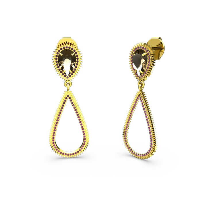 Rodolit garnet ve dumanlı kuvars 925 ayar altın kaplama gümüş küpe