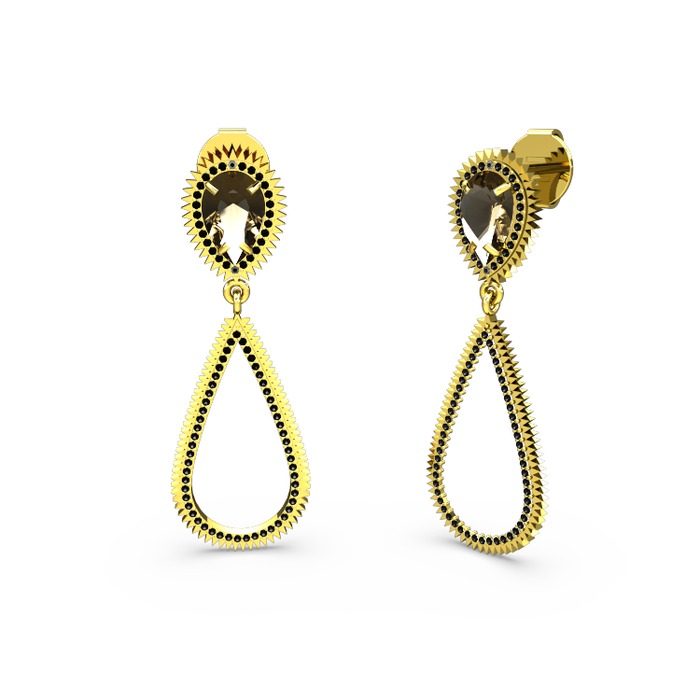Siyah zirkon ve dumanlı kuvars 14 ayar altın küpe