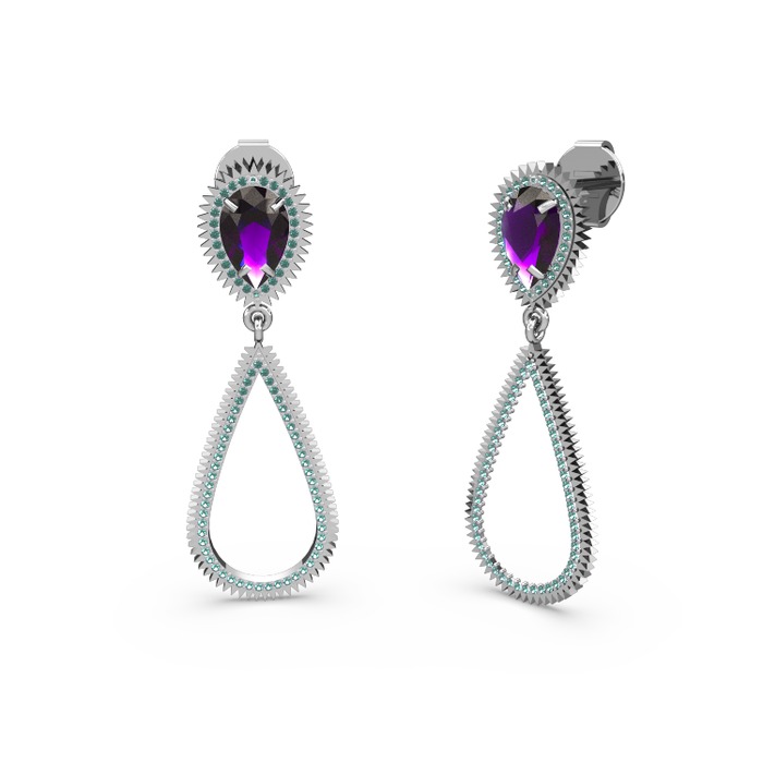 Yeşil kuvars ve ametist 14 ayar beyaz altın küpe