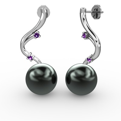 Siyah inci ve ametist 18 ayar beyaz altın küpe