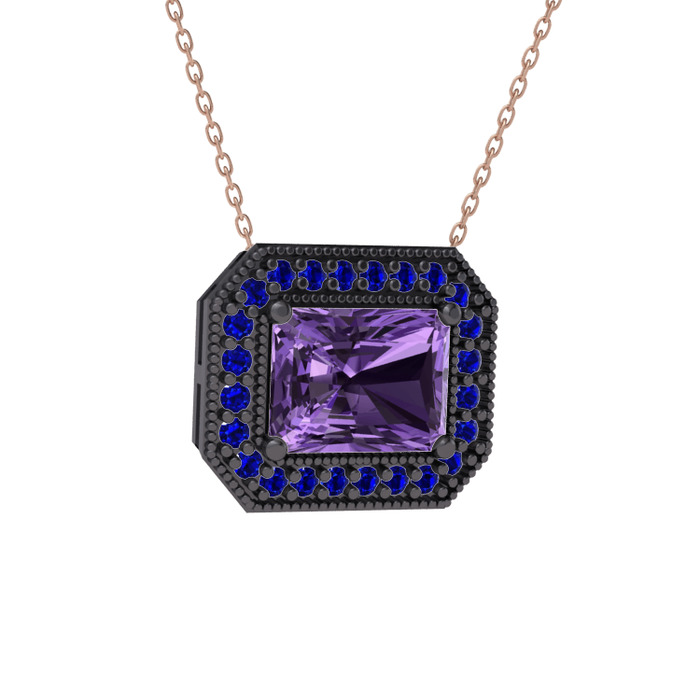 Ametist ve lab safir 925 ayar siyah rodyum kaplama gümüş kolye (40 cm rose altın rolo zincir)