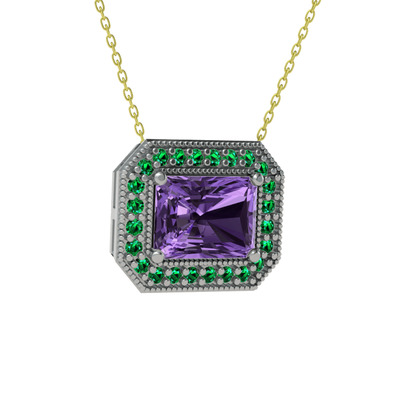 Ametist ve yeşil kuvars 8 ayar beyaz altın kolye (40 cm gümüş rolo zincir)