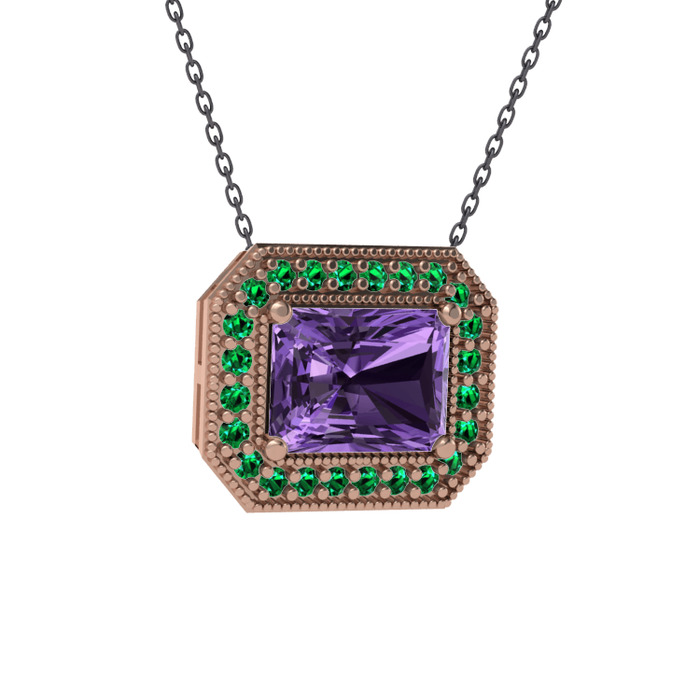 Ametist ve yeşil kuvars 8 ayar rose altın kolye (40 cm gümüş rolo zincir)