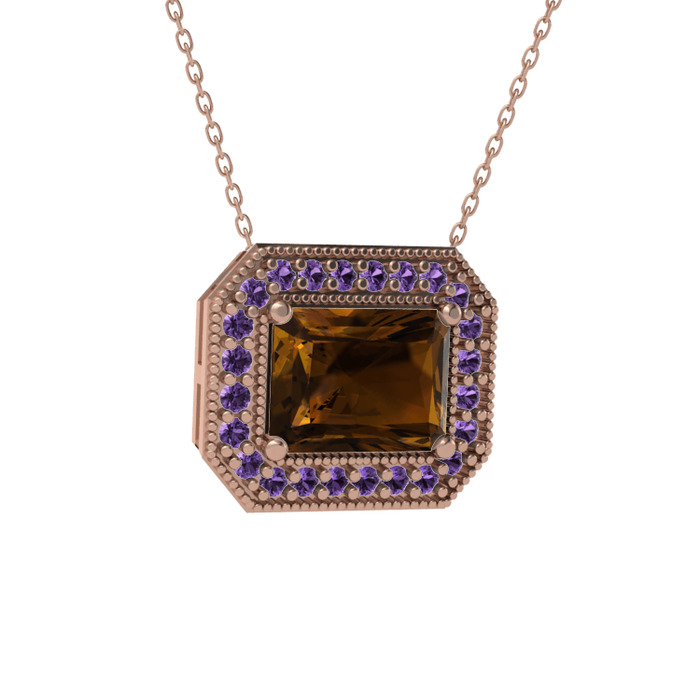 Dumanlı kuvars ve ametist 14 ayar rose altın kolye (40 cm rose altın rolo zincir)
