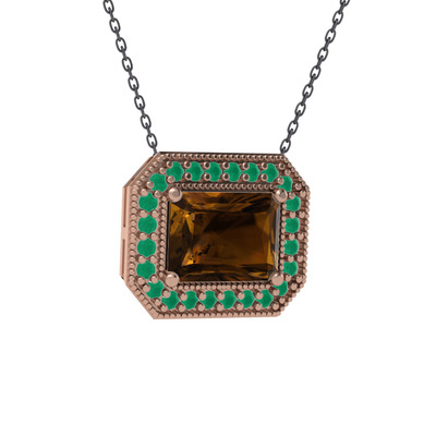 Dumanlı kuvars ve kök zümrüt 14 ayar rose altın kolye (40 cm gümüş rolo zincir)
