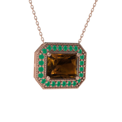 Dumanlı kuvars ve kök zümrüt 18 ayar rose altın kolye (40 cm rose altın rolo zincir)
