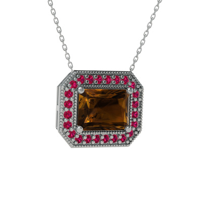 Dumanlı kuvars ve rodolit garnet 8 ayar beyaz altın kolye (40 cm gümüş rolo zincir)