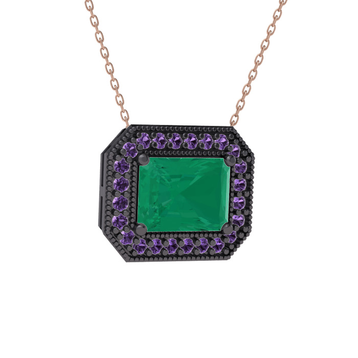 Kök zümrüt ve ametist 925 ayar siyah rodyum kaplama gümüş kolye (40 cm rose altın rolo zincir)