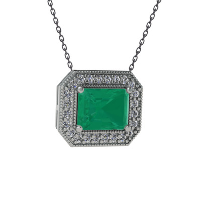 Kök zümrüt ve beyaz zirkon 18 ayar beyaz altın kolye (40 cm gümüş rolo zincir)