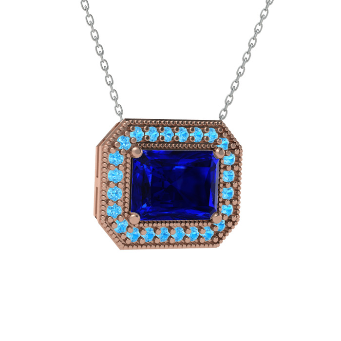 Lab safir ve akuamarin 14 ayar rose altın kolye (40 cm beyaz altın rolo zincir)