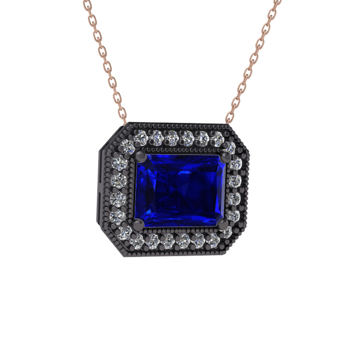 Lab safir ve pırlanta 925 ayar siyah rodyum kaplama gümüş kolye (0.253 karat, 40 cm rose altın rolo zincir)