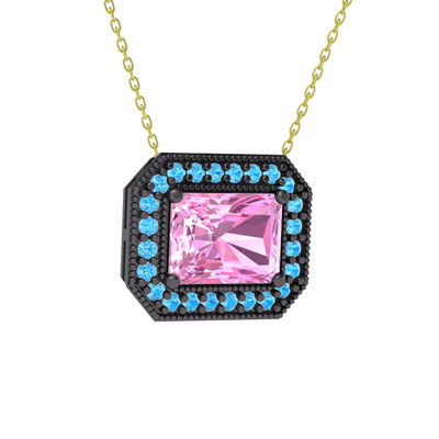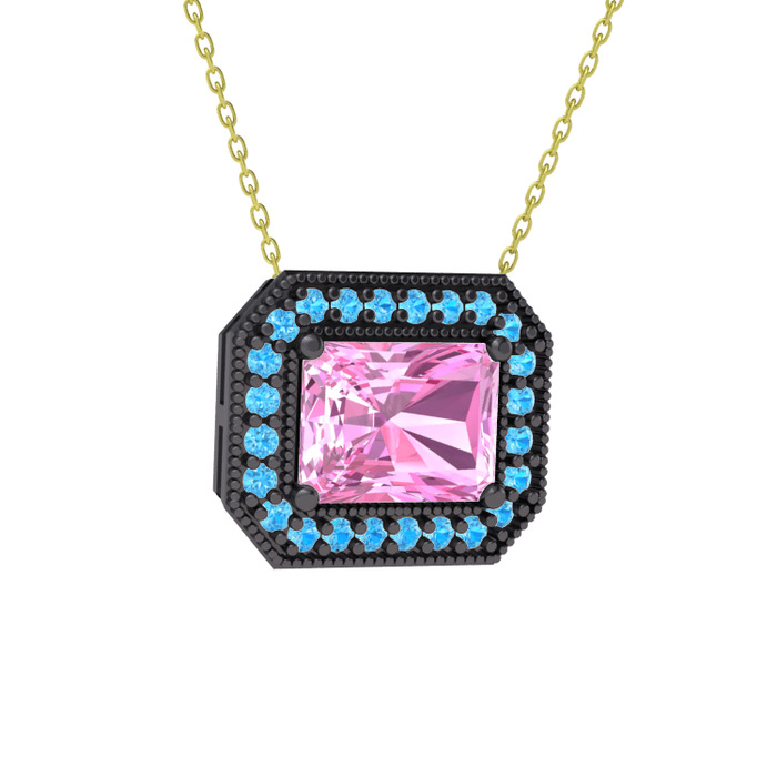 Pembe kuvars ve akuamarin 925 ayar siyah rodyum kaplama gümüş kolye (40 cm gümüş rolo zincir)