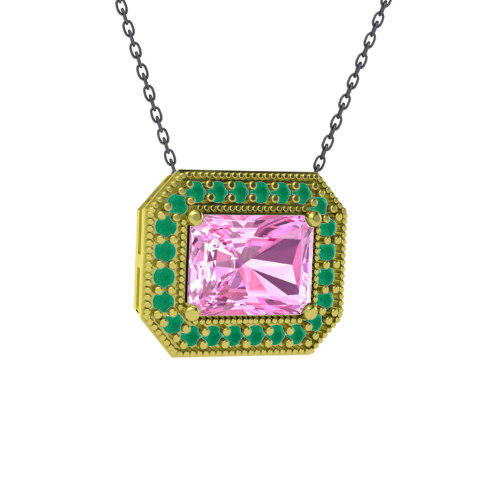 Pembe kuvars ve kök zümrüt 14 ayar altın kolye (40 cm gümüş rolo zincir)