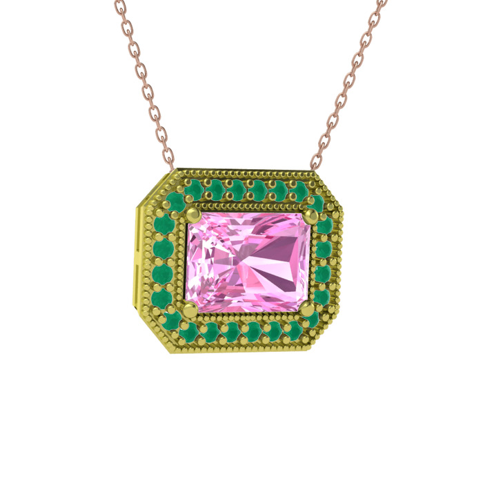Pembe kuvars ve kök zümrüt 18 ayar altın kolye (40 cm gümüş rolo zincir)