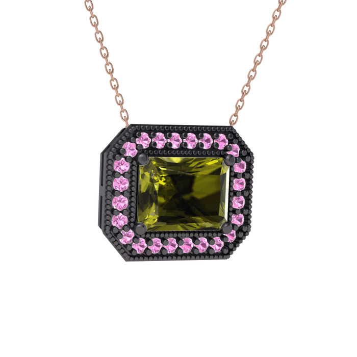 Peridot ve pembe kuvars 925 ayar siyah rodyum kaplama gümüş kolye (40 cm gümüş rolo zincir)
