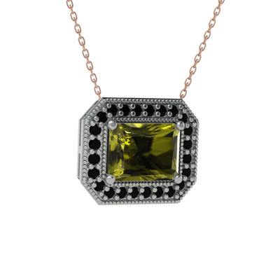Peridot ve siyah zirkon 18 ayar beyaz altın kolye (40 cm gümüş rolo zincir)