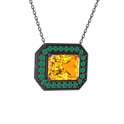 Sitrin ve kök zümrüt 925 ayar siyah rodyum kaplama gümüş kolye (40 cm gümüş rolo zincir)