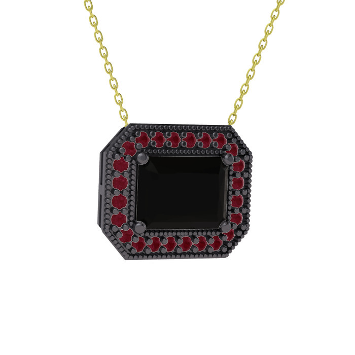 Siyah zirkon ve kök yakut 925 ayar siyah rodyum kaplama gümüş kolye (40 cm altın rolo zincir)