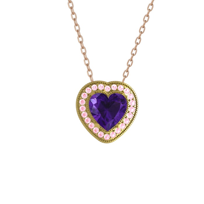 Ametist ve pembe kuvars 18 ayar altın kolye (40 cm rose altın rolo zincir)