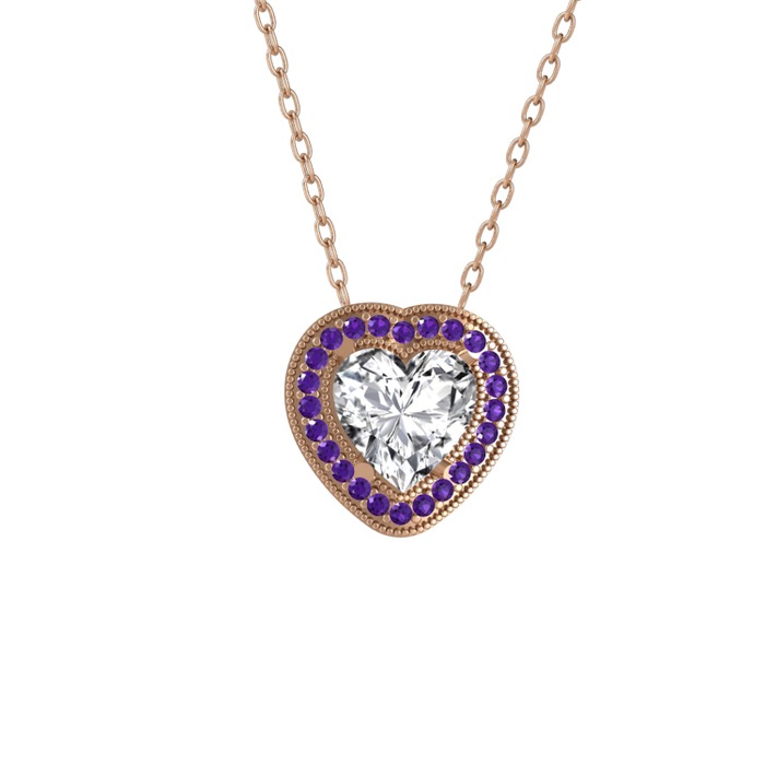 Beyaz zirkon ve ametist 14 ayar rose altın kolye (40 cm rose altın rolo zincir)