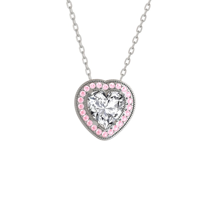 Beyaz zirkon ve pembe kuvars 8 ayar beyaz altın kolye (40 cm gümüş rolo zincir)