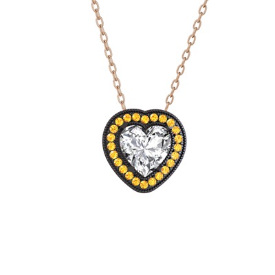 Beyaz zirkon ve sitrin 925 ayar siyah rodyum kaplama gümüş kolye (40 cm rose altın rolo zincir)