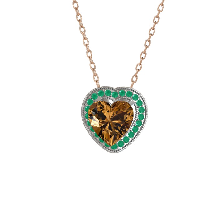 Dumanlı kuvars ve kök zümrüt 18 ayar beyaz altın kolye (40 cm rose altın rolo zincir)