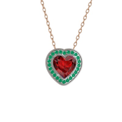 Garnet ve kök zümrüt 18 ayar beyaz altın kolye (40 cm rose altın rolo zincir)