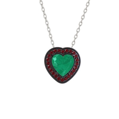 Kök zümrüt ve kök yakut 925 ayar siyah rodyum kaplama gümüş kolye (40 cm beyaz altın rolo zincir)