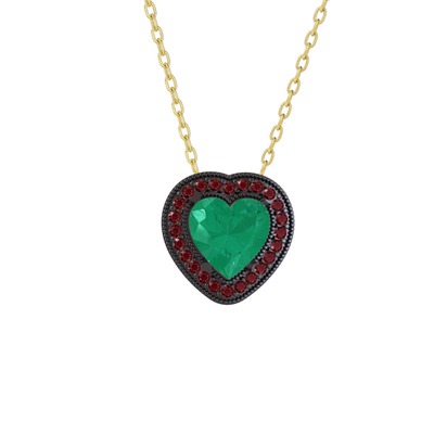 Kök zümrüt ve kök yakut 925 ayar siyah rodyum kaplama gümüş kolye (40 cm gümüş rolo zincir)