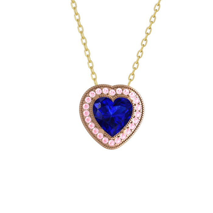 Lab safir ve pembe kuvars 14 ayar rose altın kolye (40 cm gümüş rolo zincir)