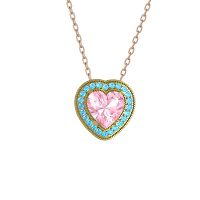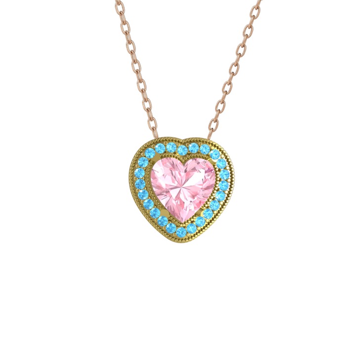 Pembe kuvars ve akuamarin 18 ayar altın kolye (40 cm gümüş rolo zincir)