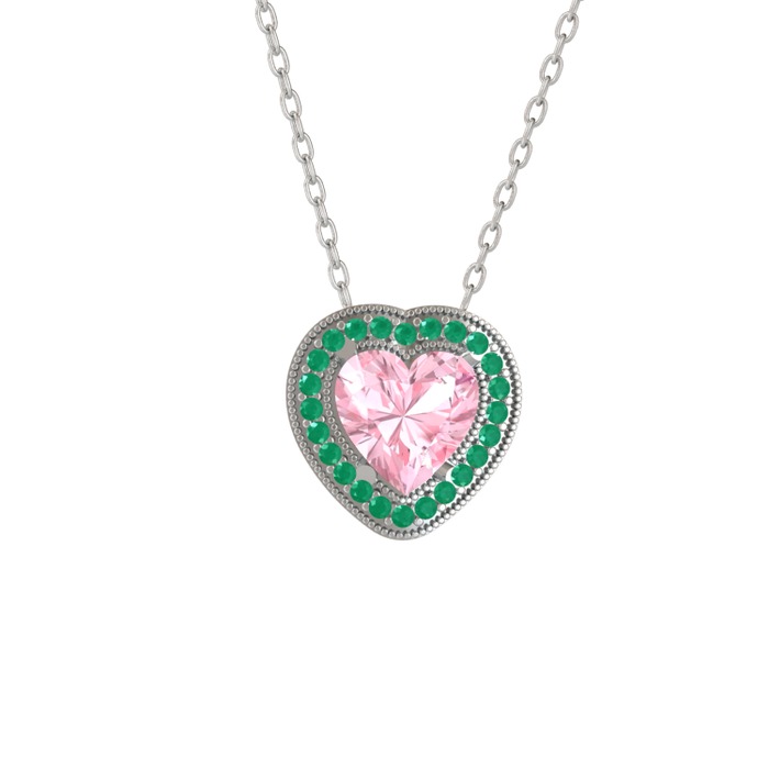 Pembe kuvars ve kök zümrüt 14 ayar beyaz altın kolye (40 cm beyaz altın rolo zincir)
