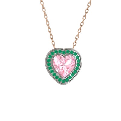 Pembe kuvars ve kök zümrüt 8 ayar beyaz altın kolye (40 cm rose altın rolo zincir)