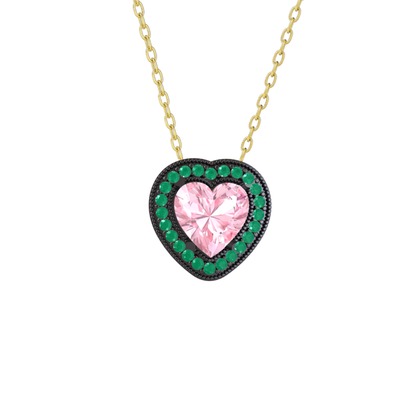 Pembe kuvars ve kök zümrüt 925 ayar siyah rodyum kaplama gümüş kolye (40 cm altın rolo zincir)