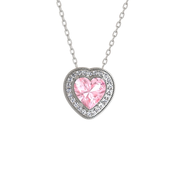 Pembe kuvars ve pırlanta 8 ayar beyaz altın kolye (0.264 karat, 40 cm gümüş rolo zincir)