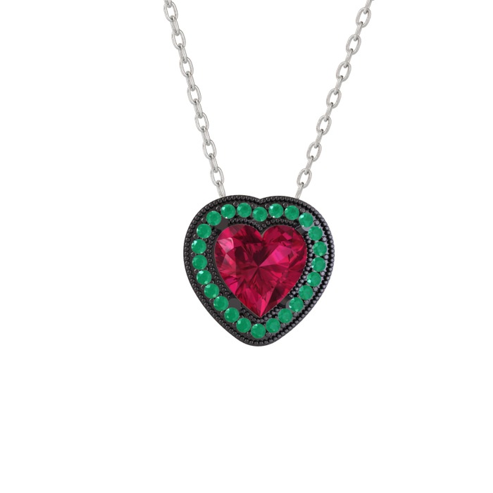 Rodolit garnet ve kök zümrüt 925 ayar siyah rodyum kaplama gümüş kolye (40 cm beyaz altın rolo zincir)
