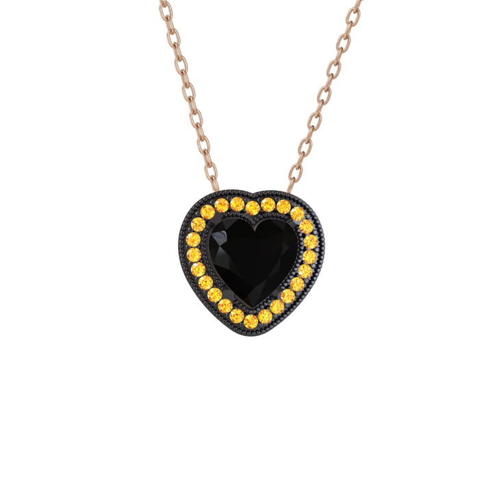 Siyah zirkon ve sitrin 925 ayar siyah rodyum kaplama gümüş kolye (40 cm rose altın rolo zincir)