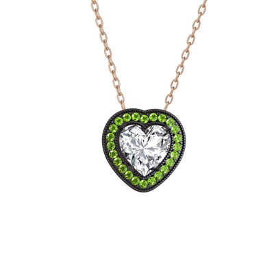 Swarovski ve peridot 925 ayar siyah rodyum kaplama gümüş kolye (40 cm rose altın rolo zincir)