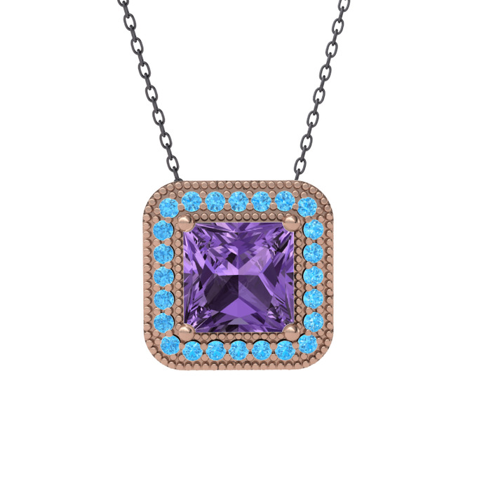 Ametist ve akuamarin 18 ayar rose altın kolye (40 cm gümüş rolo zincir)