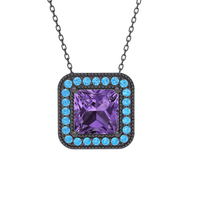 Ametist ve akuamarin 925 ayar siyah rodyum kaplama gümüş kolye (40 cm gümüş rolo zincir)
