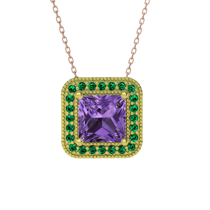Ametist ve yeşil kuvars 18 ayar altın kolye (40 cm rose altın rolo zincir)