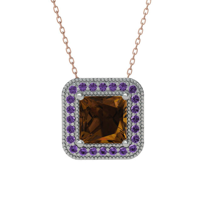 Dumanlı kuvars ve ametist 8 ayar beyaz altın kolye (40 cm rose altın rolo zincir)