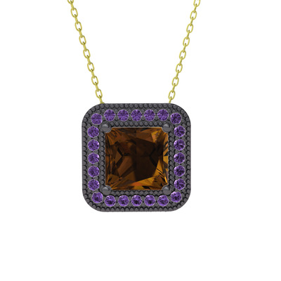 Dumanlı kuvars ve ametist 925 ayar siyah rodyum kaplama gümüş kolye (40 cm altın rolo zincir)