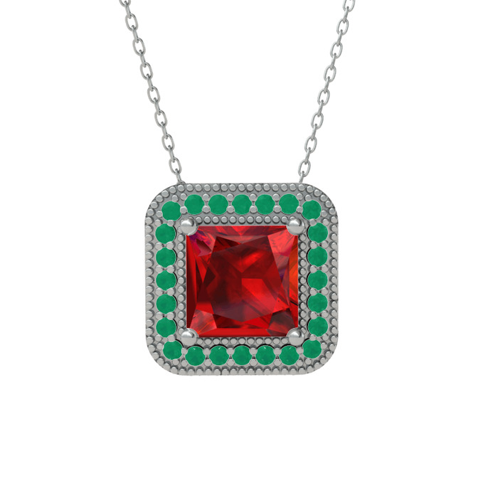 Garnet ve kök zümrüt 8 ayar beyaz altın kolye (40 cm beyaz altın rolo zincir)