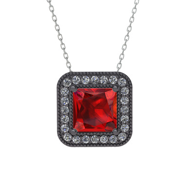 Garnet ve pırlanta 925 ayar siyah rodyum kaplama gümüş kolye (0.264 karat, 40 cm beyaz altın rolo zincir)
