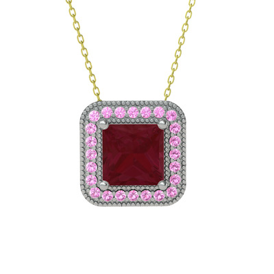 Kök yakut ve pembe kuvars 18 ayar beyaz altın kolye (40 cm gümüş rolo zincir)