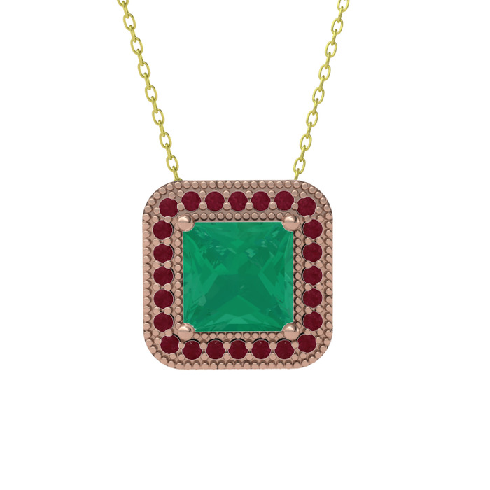 Kök zümrüt ve kök yakut 8 ayar rose altın kolye (40 cm altın rolo zincir)
